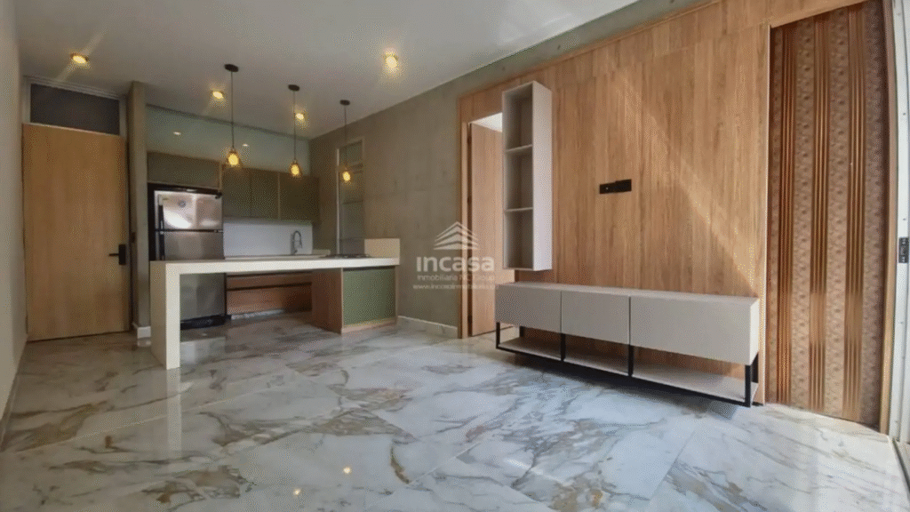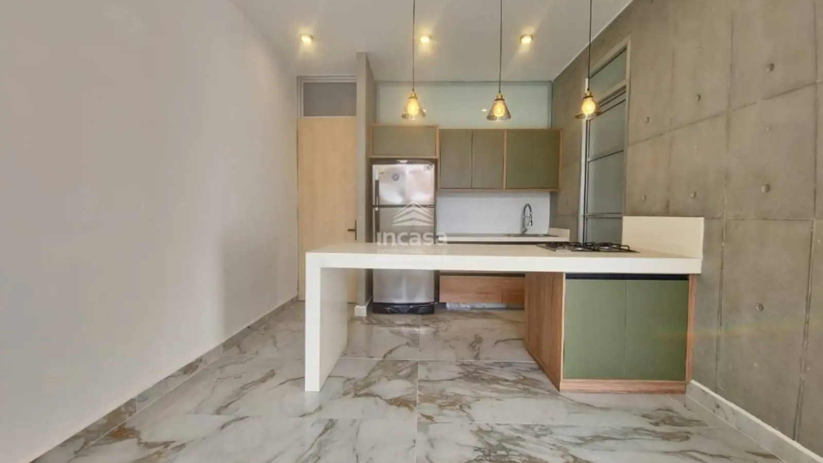 Apartaestudio con 5m2, con una habitación principal con baño privado y vestier, acompañada de una acogedora sala comedor que se integra con una moderna cocina abierta.