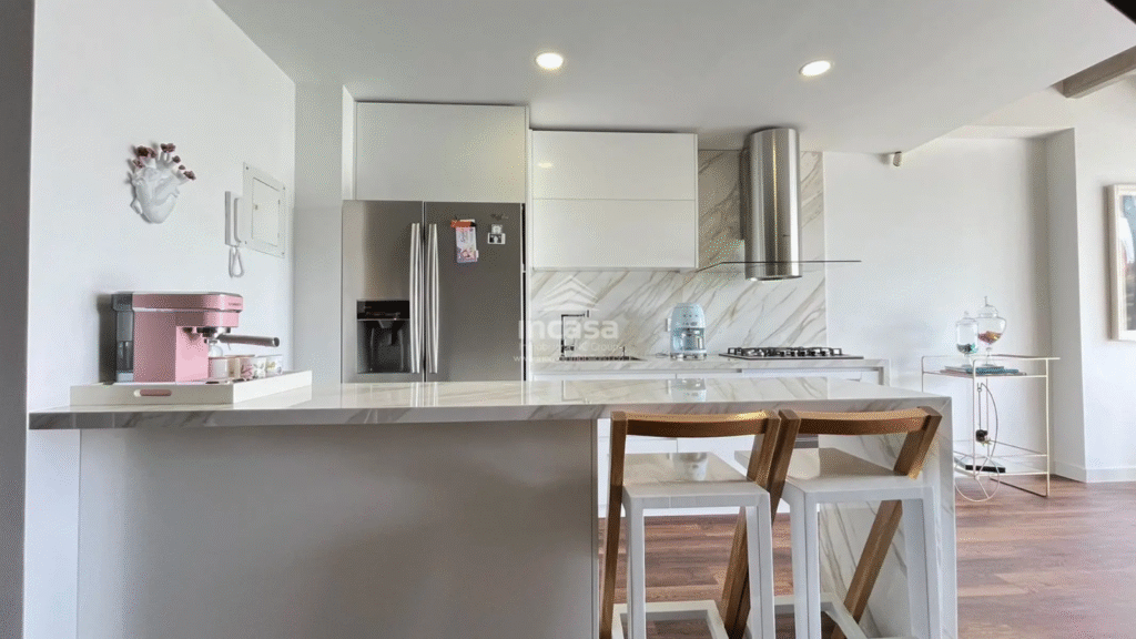 Apartamento dúplex con un área de 84 m², distribuido en espacios funcionales y modernos. Cuenta con 2 habitaciones, cada una con baño privado, baño social, hall de alcobas, sala comedor, cocina tipo americana con barra y zona de oficios.