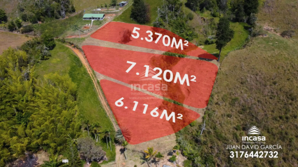 Los lotes están divididos así – 16.394 m² – 5.370 m² – 7.120 m² – 6.116 m². Área total 30.700 m²