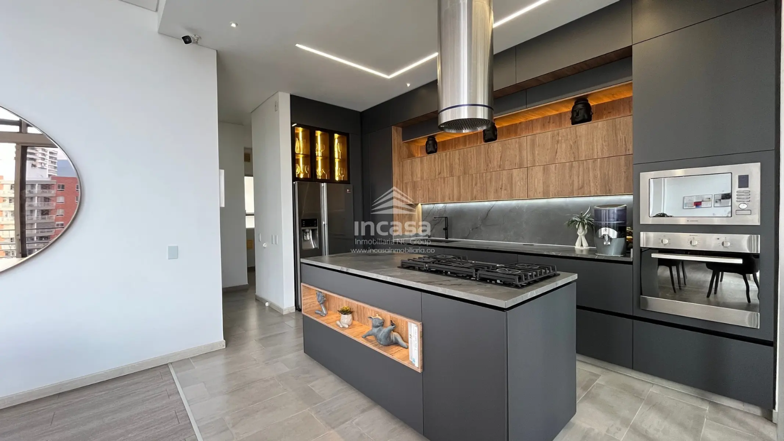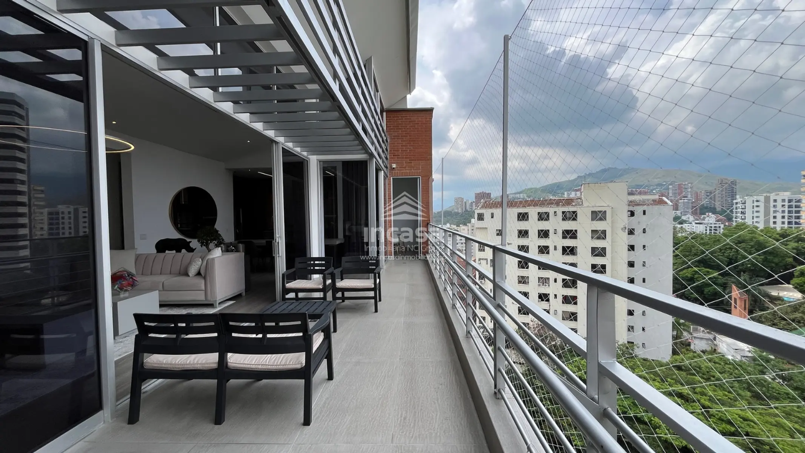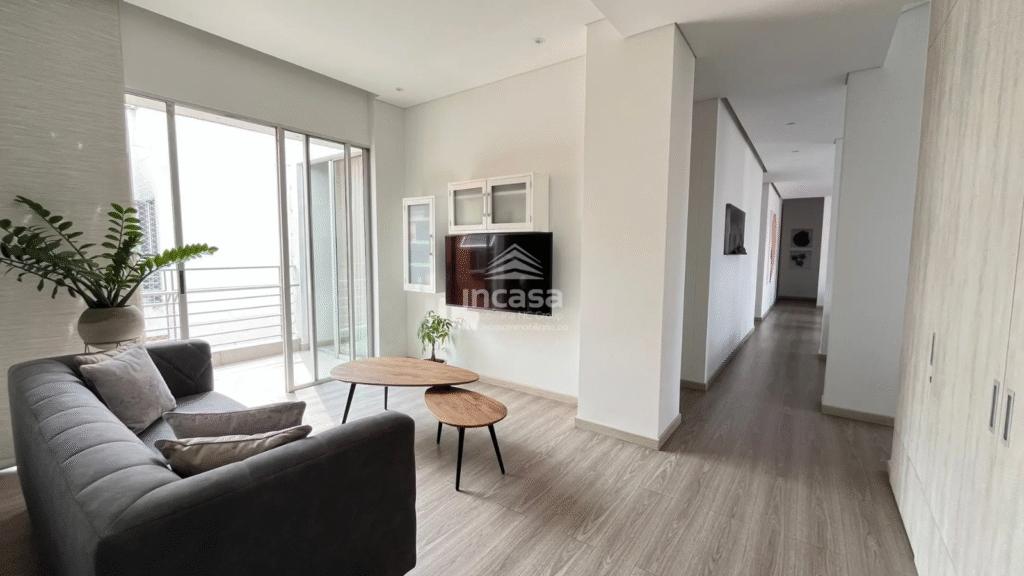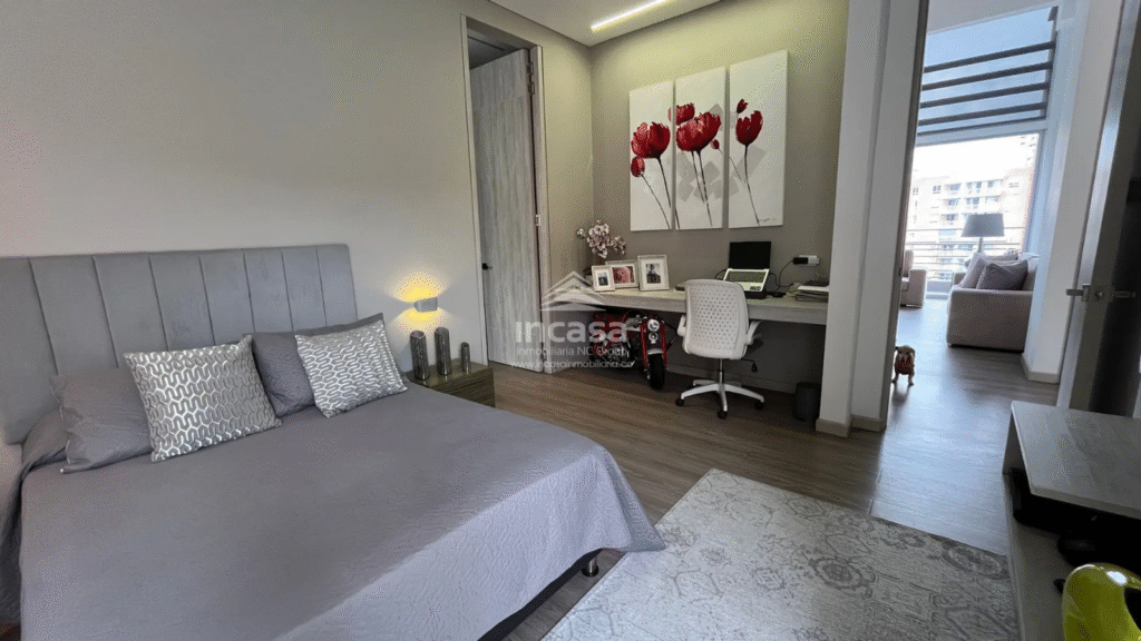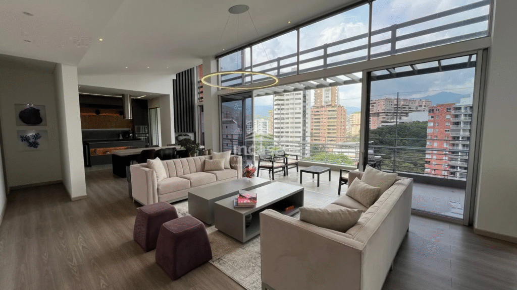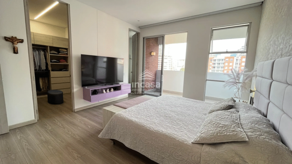 Incluye un estudio o estar de TV, una cocina abierta completamente remodelada con superficies en material sinterizado, campana italiana en acero inoxidable y comedor auxiliar, tres balcones con vistas panorámicas a Cristo Rey y al Cerro de las Tres Cruces, piscina en las zonas comunes, amplias zonas verdes, zona de oficios y cuarto de servicio con baño.