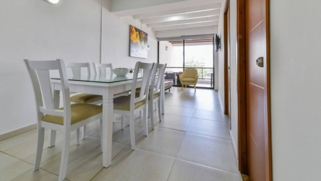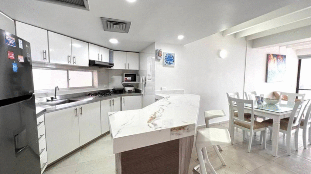 Apartamento ubicado en tercer piso, con un área de 88,29 m², que ofrece una distribución moderna y funcional. Cuenta con dos habitaciones, dos baños completos, una amplia sala comedor con excelentes acabados, cocina integral estilo americano y una agradable terraza desde donde se disfruta de una hermosa vista. El inmueble dispone de aire acondicionado y agua caliente, brindando mayor confort.